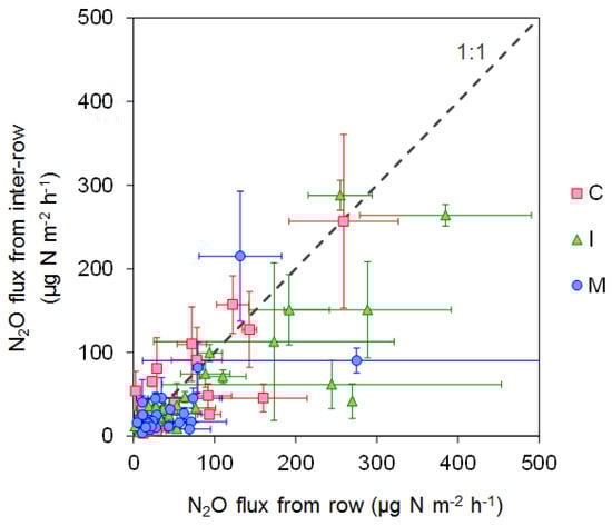 Comparison of N2O flux from row and inter-low during the soybean cultivation period after ridging. Error bars indicate standard error. C: control; I: immature compost; M: mature compost.