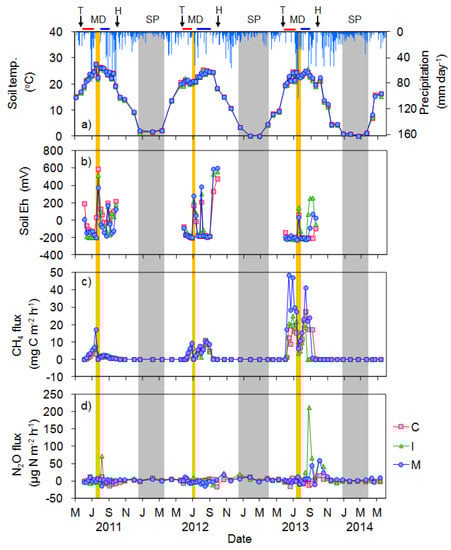 Seasonal changes in: (a) soil temperature and precipitation (bars); (b) soil Eh; as well as (c) methane (CH4) and (d) nitrous oxide (N2O) fluxes during the rice cultivation period (paddy). Positive flux values indicate emission to the atmosphere and negative indicate uptake from the atmosphere. In the late August 2013, accidental drainage with drainage system trouble occurred in the immature compost plot. C: control; H: harvesting; I: immature compost; M: mature compost; MD: Mid-season drainage (orange area); SP: snow period (gray area). Red lines before MD and blue lines after MD indicate continuous flooding and intermittent drainage, respectively.