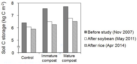 Assuming that soil carbon storage was similar for all plots at a depth of 0–30 cm before compost application for forage rice cultivation (2004–2007), the application of immature and mature compost caused carbon storage to increase by 1.16 and 1.32 kg C m−2, respectively, compared to the control plot over four years (Figure 4, Table S3). The increase in soil carbon storage occurred in the surface soil at a depth of 0–10 cm. The decreases in the carbon storage during the 3 years of soybean cultivation in the immature and mature compost plots (1.05 and 0.96 kg C m−2, respectively) were higher than that in the control plot (0.33 kg C m−2). Sixty-eight percent and 52% of the carbon increase from immature and mature compost application were estimated to be lost during the soybean cultivation period. During the soybean cultivation, soil carbon storage in the surface soil decreased remarkably in both compost application plots, with no change found in the control plot. On the other hand, during the rice cultivation period, the decreases in the carbon storage did not differ among the plots (0.17 to 0.25 kg C m−2) and were lower than those during the soybean cultivation period. During the rice cultivation, soil carbon storage in surface soil (0–10 cm) tended to increase slightly in all plots, while soil carbon storage in subsoil (10–30 cm) decreased in all plots.