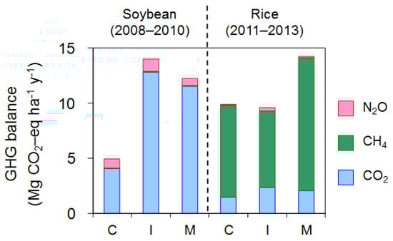 Comparison of net greenhouse gas (GHG) balance in soybean (upland) and rice (paddy) cultivation field. Positive values indicate net emission to the atmosphere. Carbon dioxide (CO2) was estimated from soil carbon loss. Methane (CH4) and nitrous oxide (N2O) fluxes were obtained by the closed chamber method. C: control; I: immature compost; M: mature compost.