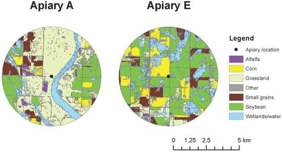 The study was conducted in two apiaries (Figure 1) in the Prairie Pothole Region (PPR) of North Dakota. Land-use conditions surrounding apiaries varied substantially (Figure 1). Land use was quantified within a 4-km radius around each apiary site using the Cropland Data Layer [26]. The two study apiaries (A and E) were previously part of a 2010–2012 large-scale landscape study examining the influence of agricultural land use on the health, productivity, and survival of honey bee colonies [2,10]; hence their legacy labels as Apiaries A and E. These two apiaries, embedded in an intensively cultivated agro-ecosystem, are characterized by dramatically divergent overall land use and habitat quality in their surrounding landscapes, despite their relatively close proximity in space.