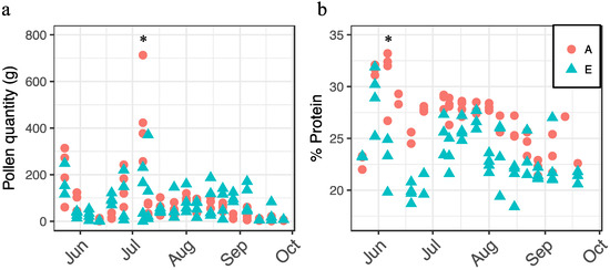 Pollen collection (a) and crude protein (percent dry weight) content (b) by apiary site (A = circles, E = triangles) and date, 2014. Asterisks denote significant dates on which responses differed between apiaries as determined by analysis of variance (ANOVA) and Tukey's honest significant difference (HSD).