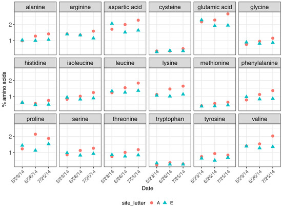 Amino acid profiles were determined on three dates from pollen samples recovered from each apiary (Figure 4). In addition to the higher crude protein content found in pollen collected by colonies at Apiary A, pollen from Apiary A also generally had higher percentage composition in the 18 amino acids analyzed. We were not able to statistically determine whether differences occurred in individual amino acid levels between apiary sites on specific dates because only one sample was analyzed from each apiary and date; however, trends suggest that little difference occurred between apiaries on each date, though perhaps levels were slightly higher in pollen collected from Apiary A (Figure 4). The overall percentage of amino acids were similar between apiaries across all sampling dates (May: t = −0.25, df = 18.8, p = 0.81; June: t = 1.31, df = 19, p = 0.21; July: t = 1.94, df = 18.1, p = 0.07).