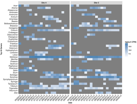 Top 40 plant genera assigned (log sum counts-per-million from all colonies within an apiary and date), 2014.