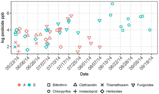 All pesticide residue data by site and date may be found in Supplementary Materials Table S3. Five insecticides in three classes (pyrethroid, organophosphate, and neonicotinoid), eight fungicides, and five herbicides comprised 63%, 30%, and 6% respectively, of the pesticide residues detected in honey bee-collected among the two study apiaries over the growing season. Overall, levels of these pesticides were significantly higher in pollen collected by honey bees at Apiary E (t = −2.11, df = 31.2, p = 0.04) compared to Apiary A. In particular, chlorpyrifos, an organophospate insecticide highly toxic to honey bees, was detected commonly and at elevated levels (sample range: 51–1260 ppb) in pollen from Apiary E, while not being found at detectable levels at all in pollen from Apiary A (Figure 6). Other insecticides included bifenthrin (detected once at each apiary), clothianidin (detected four times at A and once at E), imidacloprid (detected once at A), and thiamethoxam (detected 3 times at A and once at E). Temporal detection of insecticide residues varied between apiaries and among chemicals. Neonicotinoids were detected only between May and early July, and primarily occurred in pollen from Apiary A. Bifenthrin was detected in May and July from each apiary. Chlorpyrifos residues were first detected in early July and continued through the end of the sampling period. Herbicides were detected in May through early July, while fungicides began to be detected in early July through early August.