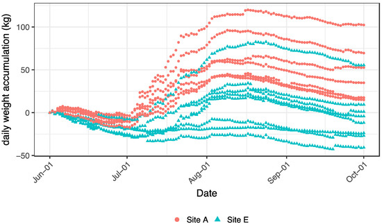 Daily colony weight accumulation among the colonies fitted with hive scales at each of the study apiaries (A and E), 1 June–1 October 2014. Data were analyzed at the apiary level, but individual colony trajectories are depicted to highlight individual colony performance variability.