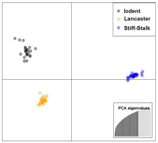 Scatterplots of the discriminant analysis of principal components of 89 ex-Plant Variety Protection (ex-PVP) maize inbred lines. Scatterplot displays the first two components using 26,768 single nucleotide polymorphism markers. Heterotic groups are represented by different colors: Iodent (black), Lancaster (yellow), and Stiff-stalk synthetic (blue), and each dot represents an individual inbred line.