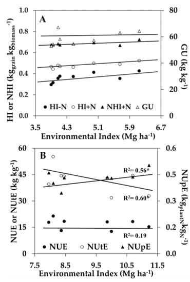 Influence of N supply and environment on selected N-use traits. (A) Changes in harvest index at low and high N (HI−N and HI+N), N-harvest index at high N (NHI+N), and genetic utilization (GU) due to the environmental index for maize hybrids grown at low N (0 kg N ha−1); and (B) Changes in N-use efficiency (NUE), N-utilization efficiency (NUtE), and N-uptake efficiency (NUpE) due to the environmental index for maize hybrids grown with high N (252 kg N ha−1). Values shown for each phenotypic trait are averaged over all the hybrids grown in each of the eight environments from 2011 to 2015. * Indicates significant slopes at p ≤ 0.001.