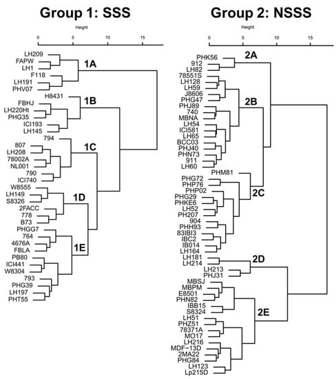 Hierarchical cluster analysis using different N-use traits of 36 stiff-stalk synthetic (SSS, Group 1) and 53 non-SSS (NSSS, Group 2) inbred lines. Clusters A, B, C, D, and E represent groups of inbreds with similar N-use trait performances. Clusters were generated using the inbreds’ GCA from 12 N-use traits. Inbred GCAs were calculated from 263 maize hybrids grown from 2011 to 2015 under low and high N conditions (0 and 252 kg N ha−1, respectively).
