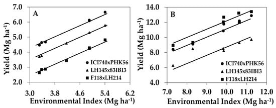 Yield of select hybrids across environmental indices when grown with (A) low N (0 kg N ha−1), and (B) high N (252 kg N ha−1). Data values are the average yields within an environment for ICI740 × PHK56 (high tolerance to N-deficiency and high positive response to N fertilizer), LH145 × 83IBI3 (high tolerance to N-deficiency and low positive response to N fertilizer), and F118 × LH214 (low tolerance to N-deficiency and high positive response to N fertilizer).