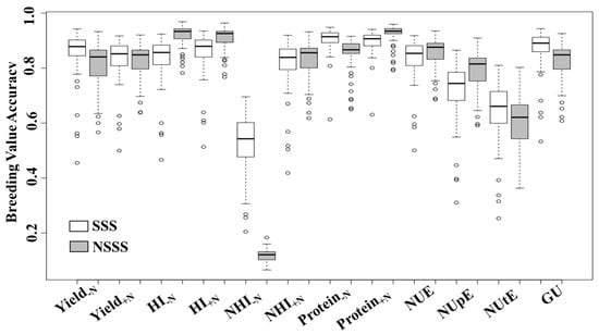 Box-plot of breeding value accuracies for yield at low and high N (Yield−N and Yield+N), harvest index at low and high N (HI−N and HI+N), N-harvest index at low and high N (NHI−N and NHI+N), grain protein concentration at low and high N (Protein−N and Protein+N), N-use efficiency (NUE), N-uptake efficiency (NUpE), N-utilization efficiency (NUtE), and genetic utilization (GU) in stiff-stalk synthetic (SSS) and non-stiff-stalk synthetic (NSSS) maize lines. Breeding value accuracy was estimated according to Equation (11). Values are based on the yield performance of 263 hybrids developed from these lines and grown in eight environments from 2011 to 2015 under low and high N conditions (0 and 252 kg N ha−1, respectively).