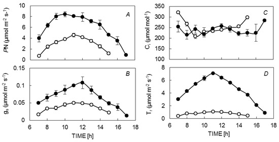 Data for the sago palm show considerable differences in net photosynthetic rate (PN), stomatal conductance (gs), and leaf transpiration rate (Tr) values between the two air temperature ranges (Figure 1). The open circles represent the PN of sago palm seedlings growing at 25–29 °C room temperature, while the closed circles represent the PN of seedlings grown at 29–33 °C room temperature. In the first daily measurement at 7:00 h, sago seedlings growing at the higher room temperature started with a higher PN than the seedlings growing at lower temperature. The plants grown at 25–29 °C maintained the optimum PN for a short period as the down-ward trend began around 12:00 h.