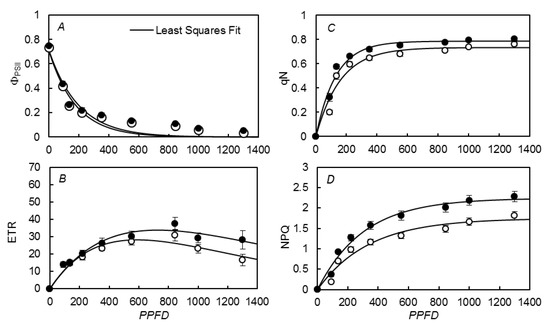 ΦPSII is the effective quantum yield, PPFD is the irradiance, allocation factor (0.5) is the partitioning energy between PS II and PS I, and 0.84 is the leaf absorbance factor (αleaf) [18]. Following Ritchie and Bunthawin [19], ETR data was fit using non-linear least squares methods calculated as