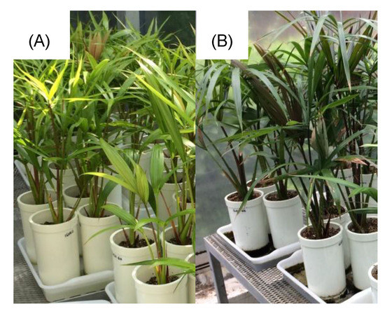 Regarding maximum temperature, morphological observation of sago palm seedlings reported that at 35 °C leaves expanded but become less green [9]. Higher air temperature also plays an important role in sago seed germination. At 30 °C, seed germination was about 20% higher than at 25 °C [10]. In physiological studies, moderate heat stress affects light energy harvesting as more light is dissipated for non-photochemical quenching rather than photochemical quenching. Therefore, the CO2 fixation process is depressed [11]. Another study confirmed that carboxylation efficiency decreased at 39 °C followed by a reduction in photosynthetic efficiency [12].