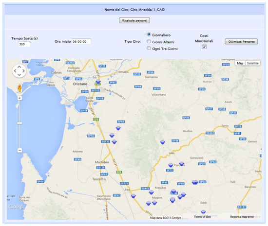 When the collection route has been defined, the operator may calculate the distance between the different points using the calculate distance command. Then, the user can optimise the milk route by choosing and inserting several parameters (time spent collecting milk, beginning time of the route, daily collection amount, capacity of the tankers) and the costs calculated by the cheese factory or the Italian Ministry of Infrastructure and Transport guidelines [36]. The ACO algorithm is used to optimise the collection route. This algorithm establishes the minimum distance that is needed to visit all the collection points. (Figure 4 and Figure 5). The interface shows the original route and the good feasible solution based on the predefined sequence for visiting the suppliers, the time taken, the cost of the route, the density of collection (L/km), and the CO2 emissions.