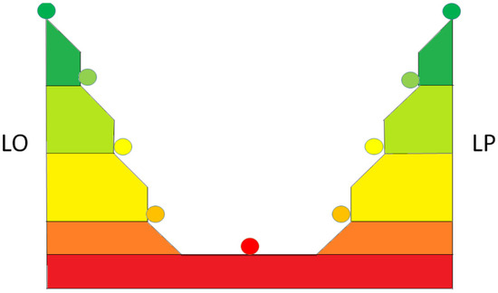 Schematization of the two-pyramid Demetra methodology (where LO = organizational level and defines and analyzes safety management from the point of view of farm organization, whereas LP = represents the operational and productive level and defines different occupational areas. Red Colour = represents maximum risk level; Green Colour = represents optimal safety conditions).