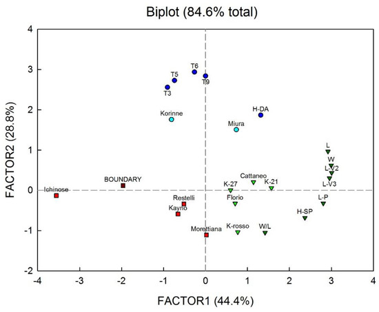 Using leaf descriptors, LDA was able to fully separate (Wilk’s Lambda statistics, p < 0.001) the 11 cultivars with a canonical discriminant function after a backward step analysis, which included L, W, L-P, H-SP, L-V2, L-V3, H-DA, T3, T5, T6, T9, W/L, and BOUNDARY. Using these 13 leaf descriptors selected by LDA, the biplot analysis showed that over 84% of the variability observed was explained by the first three factors, and about 73% was explained by the first two factors (Figure 1). k-means clustering of standardized biplot coordinates from all three factors separated the leaf descriptors into three groups (different symbol shapes in the biplot): the first associating vein angles and H-DA; the second associating blade size, vein lengths, L-P, H-SP, and W/L; and the third including BOUNDARY alone (Figure 1). Based on this clustering, some expected relationships were shown by the biplot analysis, such as various vein angles in cluster 1 and leaf-size-related descriptors in cluster 2. Leaf shape was associated with leaf-size-related descriptors rather than with vein angles, whereas H-DA was associated with vein angles. Cluster 1 included ‘Korinne’ and ‘Miura’, grouped by similar leaf angles and H-DA; cluster 2 included ‘Cattaneo’, ‘Florio’, ‘Kokusò-21’, ‘Kokusò-27’ and ‘Kokusò Rosso’, grouped by similar leaf size and shape; and cluster 3 included ‘Ichinose’, ‘Kayrio’, ‘Morettiana’, and ‘Restelli’, grouped by similar leaf margin type (Figure 1).