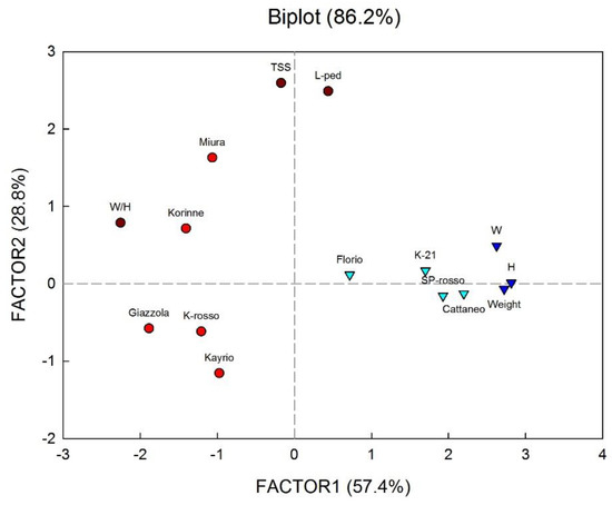 As for fruit, LDA was able to fully separate (Wilk’s Lambda statistics, p < 0.001) the nine cultivars with a canonical discriminant function after a backward step analysis including all six descriptors. In other words, all six measured descriptors were needed to get a significant discrimination of the cultivars, so no reduction of the number of descriptors could be achieved with this first analytical step. Using all six descriptors, the biplot analysis showed that about 86% of the variability observed was explained by the first two factors (Figure 2). k-means clustering of standardized biplot coordinates separated fruit descriptors into two groups; the first associating L-ped, TSS, and W/H, with the second associating W, H and weight (Figure 2). Based on this clustering, some expected relationships were shown by the biplot analysis, such as fruit-size-related descriptors, (i.e., W, H), and weight in cluster 2. Fruit shape was associated with juice sugars and peduncle length. Cluster 1 consisted of ‘Korinne’, ‘Miura’, ‘Giazzola’, ‘Kokusò Rosso’, and ‘Kayrio’, grouped by similar fruit shape, sweetness, and peduncle length; cluster 2 consisted of ‘Cattaneo’, ‘Florio’, ‘Spagna Rosso’, and ‘Kokusò-21’, grouped by similar fruit size (Figure 2).