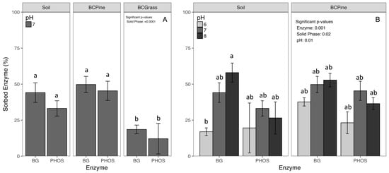 (A) The enzymes (β-Glucosidase (BG) or Acid Phosphatase (PHOS)) sorbed to the three solid phases (Soil, Pine Biochar (BC Pine), and Grass Biochar (BC Grass) at pH 7). Percent sorption was calculated as the difference between the total enzyme added and the amount in the supernatant divided by the total enzyme added (Equation 1). (B) The percent of enzyme sorbed to soil and pine biochar at three pH levels. All results are means ± 1 standard error (n = 5). Significant differences (p < 0.05) are labeled as lowercase letters from the Tukey adjusted comparisons.