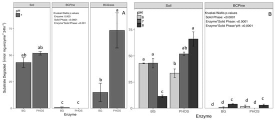 A nonparametric Kruskal–Wallis test analyzed the difference in sorbed enzyme activities between the two enzymes, solid phases, and pH levels. Again, the grass biochar only was compared at pH 7, so the effect of pH was only tested with the soil and pine biochar samples. The final activity values are presented without subtraction of the background activity, because this added unnecessary variability after error propagation, and did not change interpretation of results.