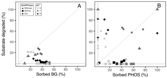 To further examine these patterns and to contrast the two enzymes, we plotted the initial data of percent sorption versus the percent of substrate degraded (Figure 3A,B). The percent of substrate degraded was calculated by taking the nmols mg enzyme−1 24 h−1 and dividing by the 40 nmols of substrate added to each well. An activity of 100% indicates all the substrate was degraded in the well. The diagonal 1:1 line represents when the sorbed enzymes degraded the expected quantity of substrate, related to the quantity of enzymes remaining in the well (% sorption). These figures show the higher efficiency of PHOS, with more points along or above the dotted 1:1 line. There was low activity of BG at pH 8 on soil and pine biochar (black diamonds and squares (Figure 3A), and low activity of both enzymes immobilized on the pine biochar (squares, Figure 3A,B).