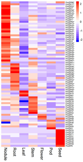 The set of 78 PvbZIP TF genes considered in this work are listed in Table S1. The P. vulgaris Gene Expression Atlas (Pv_GEA) [16] presents data about the expression profiles in different plant tissues of the different TF families, including the PvbZIP family. In Figure 1 we show the expression profile (heatmap as Z-scores) of the PvbZIP genes in nodule, root, leaf, stem, flower, pod, and seed tissues. The level of expression of the PvbZIP genes across different tissues according to Pv_GEA, is shown in Figure S1. Three (PvbZIP19, PvbZIP77, PvbZIP78) out of 78 PvbZIP genes were not included in Figure 1 and Figure S1 because they were not expressed in any plant tissue [16]. It is evident that the majority of PvbZIP family members (46) were more expressed in the underground tissues in comparison to the other tissues, 32 in nodules and 14 in roots. Stem and seed showed nine PvbZIP with highest expression in each tissue. Very few PvbZIP genes were highly expressed in leaf, flower and pod (3, 3, and 5, respectively).