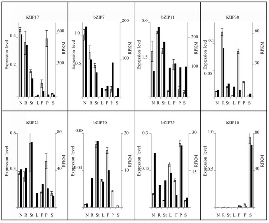 We used qRT-PCR gene expression analysis to assess the reliability of the RNA-seq data regarding the expression profile of PvbZIP genes in different plant tissues. For this we selected PvbZIP genes that, according to Pv_GEA [16], showed highest expression in different plant tissues: two PvbZIP with highest expression in nodules (PvbZIP17 and PvbZIP7), two in root (PvbZIP11 and PvbZIP30), two in stem (PvbZIP21 and PvbZIP70), one in pod (PvbZIP75) and one in seed (PvbZIP10). For each selected PvbZIP gene, Figure 2 shows the expression level determined by qRT-PCR compared to data from RNA-seq analysis [16]. The qRT-PCR expression level of all the selected genes was highest in the same plant tissue reported in the Pv_GEA and the expression levels in other tissues showed good correspondence, as seen in Figure 2. However, there are some exceptions to the latter (i.e., PvbZIP17 in pods, PvbZIP30 in flowers and pods, PvbZIP70 in roots, PvbZIP75 in roots): the different expression levels could be attributable to different sensitivities of the two methods and/or natural variation of the plant tissues used for each approach, since these derived from experiments in different laboratories and dates. We conclude that our qRT-PCR expression analysis of selected PvbZIP genes validated the transcriptome data from the Pv_GEA.