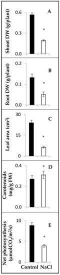 Effect of salinity on fertilized common bean plants. Plants of cultivar CC-25-9-N were grown under control condition (black bars) or salinity treatment (100 mM NaCl, white bars). Shoot (A) and root (B) dry weight, leaf area (C), carotenoids content (D) and net photosynthesis (E) were determined after 7 days of growth. Values represent the average ± SD from three biological replicates from different plant sets. Asterisks indicate significantly different means between plants grown under salinity vs. control treatments (Student’s t-test, p ≤ 0.03).