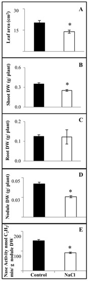 The SNF is a characteristic feature of legume plants that is relevant for sustainable agriculture. Thus, in this work we analyzed the effect of salt on CC-25-9-N plants inoculated with R. tropici CIAT 899, an acid-tolerant strain [24], in a hydroponic system with N-free nutrient solution [25]. In initial trials with different NaCl content added to SNF common bean plants we observed that nodulation was drastically inhibited when 20 mM NaCl was added, causing very few small and inactive nodules to be formed, while higher NaCl concentrations totally prevented nodulation. Thus, we selected 15 mM NaCl for the salinity-treatment of rhizobia-inoculated common bean plants grown hydroponically. Figure 4 shows the phenotypes of these plants as compared to control plants (student’s t-test, p ≤ 0.01). The leaf area of salt-stressed SNF plants decreased 31%, as seen in Figure 4A. The shoot biomass of stressed plants decreased 28% compared to control plants, shown in Figure 4B,C, but no significant effect was observed in their root dry weight. The effect of salt on the common bean-rhizobia symbiosis was evident in terms of nodule biomass and nitrogenase specific activity, both of which decreased to about 40% of the values for control plants, as seen in Figure 4D,E.