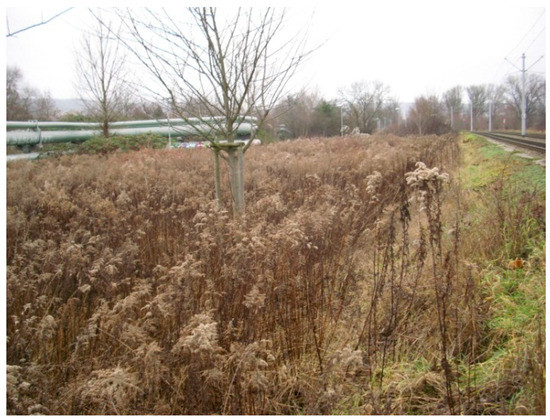 In the outskirts of Jena (Germany), an undisturbed colony of giant goldenrod had grown up along a tram line after its completion in the 1980s. In 2009, the plants had reached 2.10 m in length on the non-contaminated soils of alluvial river sediments and reduced the portion of accompanying grasses to an estimated 2%–4% of the total biomass (Figure 1). An area of 36 m2 was marked for the consecutive collection of plant and soil material starting in August 2015. Winter wheat cv. Kavalier established on a non-contaminated arable soil derived from mottled sandstone was harvested with a New Holland CX 6090 Elevation harvester (New Holland Agiculture, Torino, Italy) on 23 July 2017. The harvestable straw cut across a width of 8.50 m was discharged on strips 1.60 m wide. On 19 September, the 1.60-m discharge was marked by the dense regrowth of wheat emerging from spilt grains. The lateral strips mainly bore common weeds (Figure 2). The respective biomasses were determined and their mean was referred to 8.50 m.