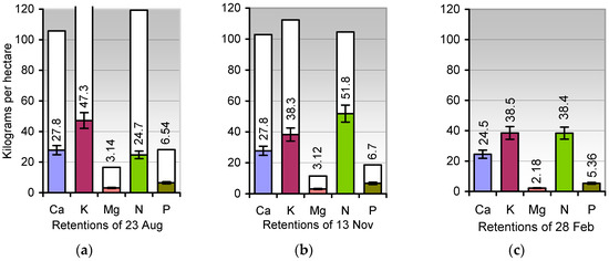 The loss in minerals was greatest for monovalent cations such as K and Na, less for divalent ones, and least for organic N and P compounds [32,55]. The canopies of deciduous and evergreen trees lost approximately 15% of their annual above-ground nutrient return in N and P, and 48%–59% in K, to the soil by leaching [56].