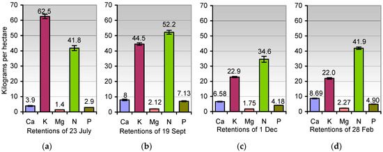K resources of the regrowth peaked in September but could not prevent that 40.5 kg ha−1 as the only net losses were released to the soil from 23 July to 28 February. Fluctuations in the stock of CaMgZn remained negligible (Table 3, Figure 4).
