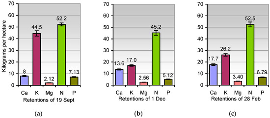 Goldenrod: The cropland retention of the minerals (kg ha−1, figures heading the columns) both in dry 16-cm stubbles and roots during blooming (23 August, (a)), maturity (13 November, (b)), and resprouting (28 February, (c)). White column segments indicate the sums of minerals in shoots and roots prior to harvest (K, 178 kg ha−1 on 23 August). All columns refer to the zero axis. See Table 2 for details. Error bars indicate ± SD. NPK stock in stubbles/roots from 23 August to 28 February (kg ha−1): 78.5, 96.8, 82.3.