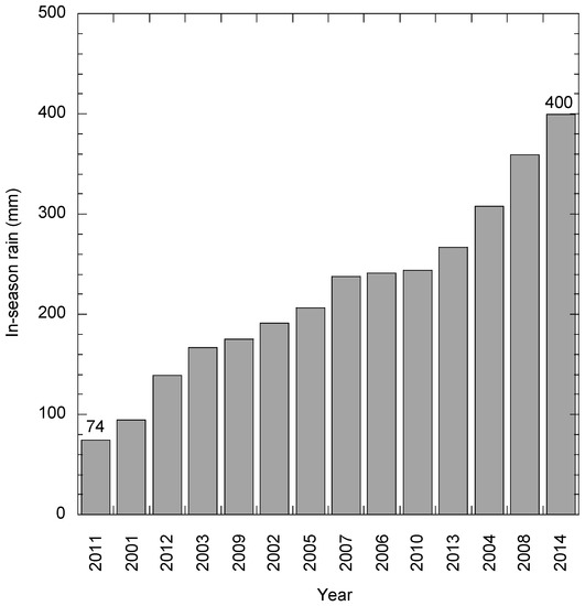 The total rain at Lubbock, Texas during the 150-day interval between 15 May and 12 October for the 14-year period, 2001 to 2014. Data from historic weather at the study site.