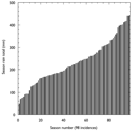 The seasonal rain totals for the study-site for the interval between DOY 90 and DOY 328. Note that the two years of the study, 2016 and 2017, are mid-range in rain for the season.