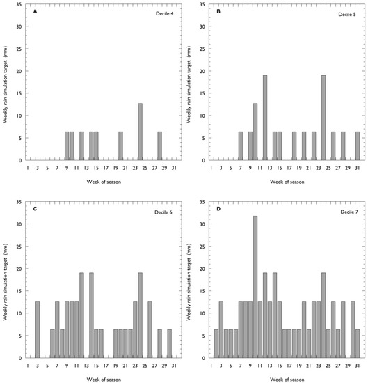 The weekly rain targets for the 4th through 7th decile treatments (panels A–D) of the rain simulation protocol. Week 1 starts on DOY 90 and week 32 starts on DOY 307. The rain targets are in units of mm.