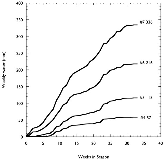 The rain simulations in this study were derived from the 14-year rain history at the site based on a series of seven sequential plantings possible for a cotton crop. For each of the 14 years in the study, the 238-day growing period between DOY 90 and DOY 328 (1 April to 24 November) was divided into 34 sequential 1-week intervals. This produced 14 rain amounts for each of the 34 weeks of the growing period for a total of 476 rain events. The distribution of rain amounts over the 14 years was determined for each of the 34 weeks. The rain amounts for each week were broken into deciles and the fourth, fifth, sixth and seventh decile amounts were chosen for rain simulations. The selection of the mid-range of the rain amounts (deciles 4 through 7) for rain simulations was based on our interest in moderate rain years compared to extremely dry and wet production years of the region. Each decile group consists of a series of 34 weekly rain amounts to be used as study-rain targets and provide the basis for weekly irrigations to supplement rain during the season. During the season, the weekly difference between rain and the study-rain targets determines if irrigation is applied or withheld. On a weekly interval, if rain < the study-rain target then irrigation is applied and if rain > the study-rain target irrigation is canceled. The study-rain targets for 34 weeks of the annual study period (1 April through 24 November) are shown for deciles 4 through 7 in the Figure 3. Figure 4 shows the sum of the target amounts produced by the different deciles. The amounts, temporal distribution and number of study-rain targets vary across the treatment deciles. Simulated-rain generated by the 4th decile results in eight simulated-rain events with a total volume of 57 mm while the 7th decile produces 29 simulated-rain events with a total volume of 336 mm.