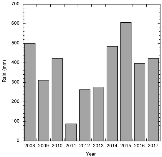 Rain during the entire study interval from 15 March to 15 November was 431 mm for 2016 and 401 mm for 2017. The total amounts are in the mid-range of rain at the location over the past 10 years with four years of lesser rain and four of greater amounts (Figure 5).