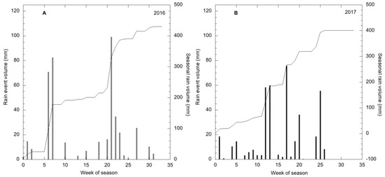 The amounts and pattern of rain events over the 2016 (A) and 2017 (B) study years. Week 1 starts on DOY 90. The bars represent weekly rain totals and the solid line represents the cumulative rain.
