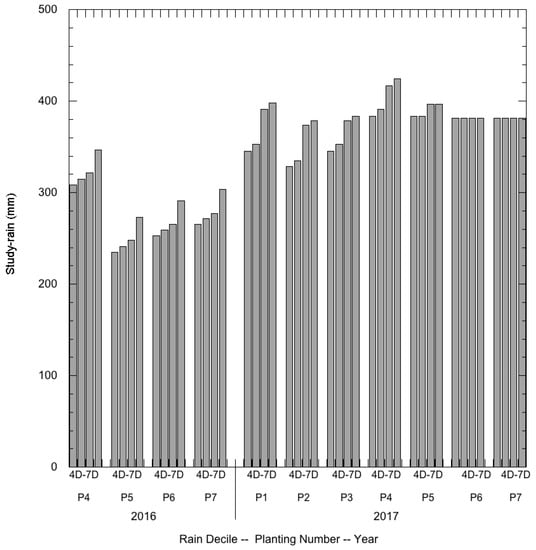 Given the above-average rain during 2016 and 2017, the rain exceeded the study-rain that was established in the 4th through 6th decile targets across all planting dates and exceeded the 7th decile targets in 33 of 44 water level plantings. The results underscore the limitations on a rain matrix when the rain amounts are above the range of study-rain defined by the treatment deciles. We chose to use the 4th through 7th deciles of rain as the treatment deciles in order to explore crop performance in the drier years as opposed to the wetter years of the rainfed environment. If rain in subsequent years of the matrix study is below normal we would anticipate a greater enhancement of study-rain to be produced. Regardless of the effectiveness of the rain simulations there was substantial variation in study-rain over the matrix (relative to the rain history of the region).