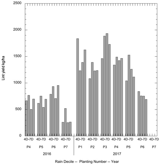 The yield for both years across the rain matrix treatments is shown in Figure 8. The yields in 2016 were lower across all treatments compared to 2017. The yield varied from 100 to 1900 kg/ha (planting 7, 4th decile in 2017 and planting 3, 6th decile in 2017). The extremely low yield in the 7th planting of 2017 is evidence of the planting not reaching maturity before the end-of-season freeze. Unlike the study-rain variation (Figure 7), there is no clear rain-decile effect evident.