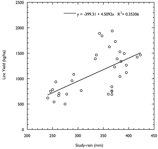 The lint yield as a function of the study-rain (rain + simulated rain) for four plantings in 2016 and seven plantings in 2017 with four rain simulations in each planting. R2 = 0.35.