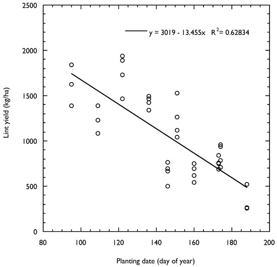 A goal of the study was to enhance the number of yield:rain pairs for cotton that could be produced in a single year. In addition to variation in study-rain, the sequential plantings used in the rain matrix result in a series of cotton crops that develop in different environments in terms of other important weather variables (e.g., temperature, humidity, solar radiation). Over the two-year study interval, the rain matrix resulted in a number of yield:environment pairs with differences in rain amounts. Thus, each entry in rain matrix results in a yield:environment pair with yield:rain pairs as a subset. The yield:environment pairs are represented by the relationship between planting dates (different crop environments) and yield (Figure 10). The relationship between planting date and yield was relatively strong (R2 = 0.63) indicating that the putative environmental variability associated with planting dates contributed to variation in yield.