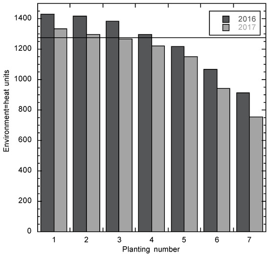 Accumulated environment-heat units for seevn plantings/year in 2016 and 2017. Environment-heat units represent heat units (15.5 °C base) that accumulated between the planting date and November 20 in each year. The horizontal line indicates 1250 heat units that are a putative benchmark for crop maturity. Plantings 1 through 3 in 2016 were lost to a hailstorm and never reached maturity date.