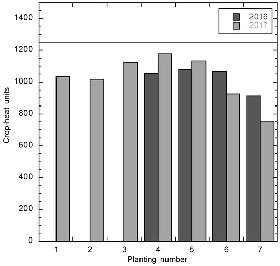 Accumulated crop-heat units for four plantings in 2016 and seven plantings in 2017. Crop-heat units represent heat units (15.5 °C base) that accumulated between the planting date and the date that the planting reached maturity in each year. The horizontal line indicates 1250 heat units that are a putative benchmark for crop maturity.