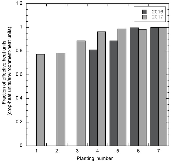 The difference between the environment-heat units and crop-heat units for the various plantings is shown in Figure 13. This number is potentially important since it indicates the fraction of environment-heat units that could have contributed to growth and development had the crop not reached maturity before the end-of-season freeze. Perhaps metric of “crop-heat units as a fraction of environment-heat units” could be seen as a measure of heat units that were available but not “used” by the crop. Crop-heat units as a fraction of environment-heat units indicates that in 2016, the crop-heat units comprised <90% of those available in plantings 4 and 5 (81% and 88%) while for plantings 6 and 7, the crop-heat units comprised 100% of those available. The pattern was similar in 2017 with crop-heat units comprising <90% of those available in plantings 1, 2, and 3 while plantings 4, 5, 6, and 7 the crop-heat units comprised 100% of those available. Out of the 11 plantings in the study, five could be considered to be not-limited in terms of available heat units (4 and 5 in 2016 and 1, 2, and 3 in 2017) and six were potentially limited by heat unit availability (6 and 7 in 2016 and 4, 5, 6 and 7 in 2017).