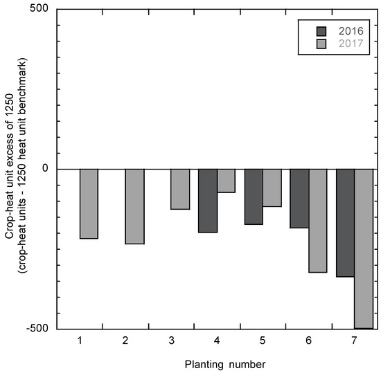 Difference between crop-heat units and the 1250 heat unit benchmark (total crop-heat units −1250). Data for four plantings in 2016 and seven plantings in 2017. Crop-heat units represent heat units (15.5 °C base) that accumulated between the planting date and the date that the planting reached maturity in each year. Negative values indicate crop-heat unit accumulation was less than 1250.