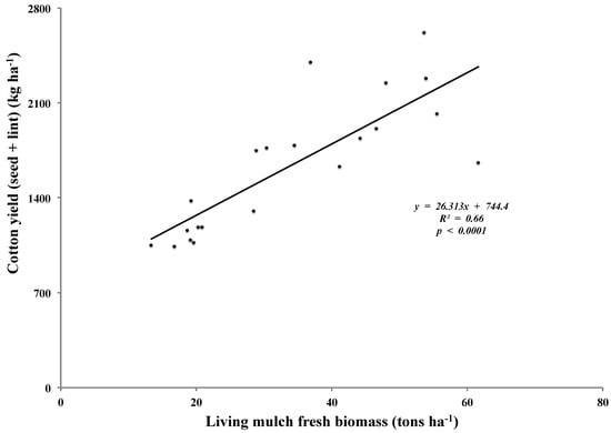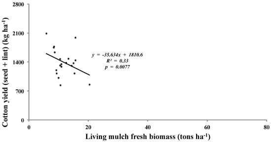 Although no treatment by year interaction was found for the sesbania and sunnhemp treatments, all cotton parameters differed in Year 1 and Year 2- yield (1467 and 1780 kg ha−1, respectively; p = 0.04), height (92 and 139 cm, respectively; p < 0.0001) and boll count (27 and 44, respectively; p = 0.0002). In Year 1, across Sites 1 and 2, cotton yields from all the living mulch treatments (sesbania (1343 kg ha−1), sunnhemp (1380 kg ha−1) and sorghum sudan grass (1315 kg ha−1)) did not differ from each other or the control (1585 kg ha−1) (p = 0.19) (Table 4). Although the treatments did not have any effect on cotton yields, there was a negative correlation (p = 0.0077) between cotton yield and living mulch biomass (Figure 1).