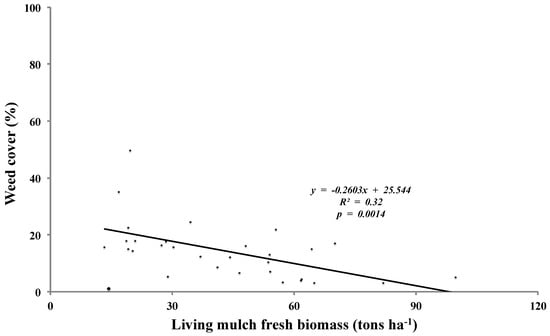 From Year 1 sesbania and sunnhemp data, there was no correlation (p = 0.84) between weed cover and living mulch biomass. In contrast, Year 2 data from the same treatments showed a negative relationship (p = 0.0014) between weed cover and living mulch biomass (Figure 3). Living mulch performance was greatest at Site 3 and here, weed suppression was excellent (Table 6). At this site, high living mulch vigor and regeneration and healthy, long-lasting stands led to multiple successful mowing operations (Table 2) and consequently, thick surface mulch. Sesbania and sunnhemp produced an average of 59 and 79 tons ha−1 of fresh biomass, respectively, the greatest amounts recorded in these trials (Table 6). Average living mulch ground cover in sesbania and sunnhemp plots at Site 3 were 85 and 97%, respectively. These living mulch stands were so vigorous that average weed cover was only 7% in both treatments. Living mulches at Site 3 remained healthy through cotton harvest in December. At Sites 1 and 2, the living mulches began to dry up and senesce by October.