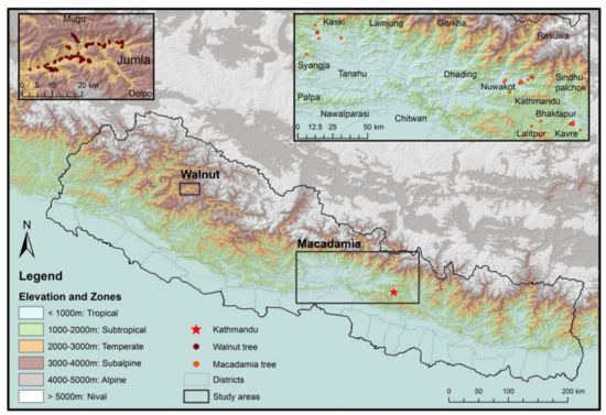 We chose to focus on nut crops in Nepal as they are relatively new to farmers there and represent an innovative livelihood strategy where they are grown. Macadamia and walnut are the most widespread of the different nut trees in Nepal [5]. According to our observations, the commercialisation of both value-chains is in its infancy as both nuts only gained popularity in recent years [5]. Understanding the motivation for and success of this new strategy of nut cultivation was a major motivation for the Helvetas project, to which this study is linked, as there is missing research specifically on nut cultivation in Nepal [5]. Macadamia (Macadamia integrifolia) are newcomers and were introduced to Nepal in 1970 by a joint project of the Food and Agriculture Organization of the United Nations, and the Australian and Nepalese governments. The most suitable areas for growing macadamia in Nepal are the tropical and sub-tropical zones at a mean elevation of 60–1700 m [5,49,50]. In the temperate and cold zones at an elevation of 1200–3000 m, two types of walnuts (Juglans regia L.) are present: the indigenous hard-shell walnut tree and the soft-shell walnut tree, which was introduced to Nepal and is comprised mainly of cultivars and populations selected for crop production [51,52]. There is no clear history about the introduction of soft-shell walnuts to Nepal. During our survey, several farmers said that their grandfathers introduced the well-producing Kashmiri walnut when they came back from working in India.